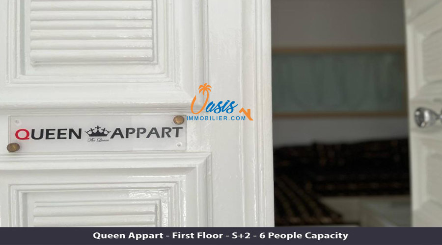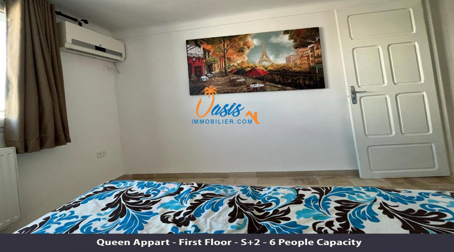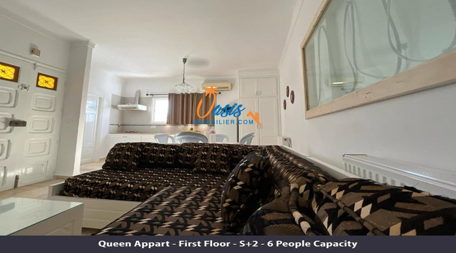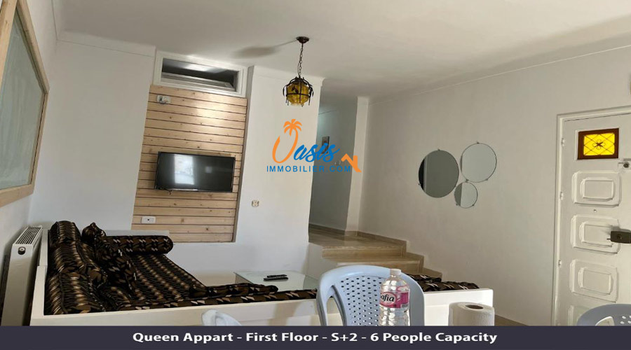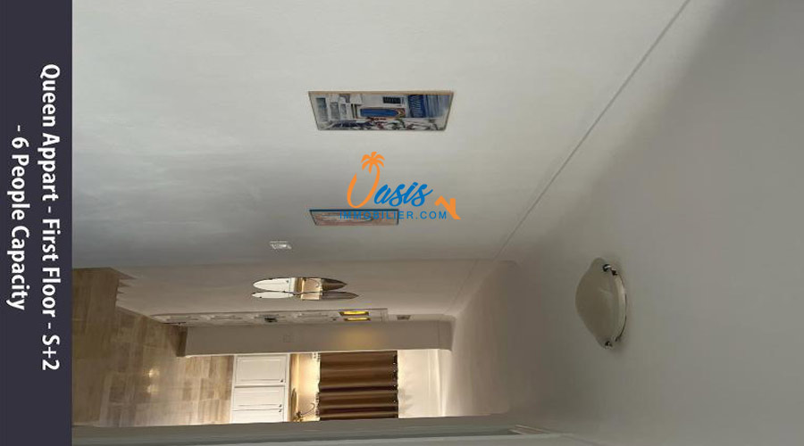 A vendre appartement S+2 a 200m de la plage de superficie 67.8m² composé de salon,cuisine ouverte, deux chambre et SDB.