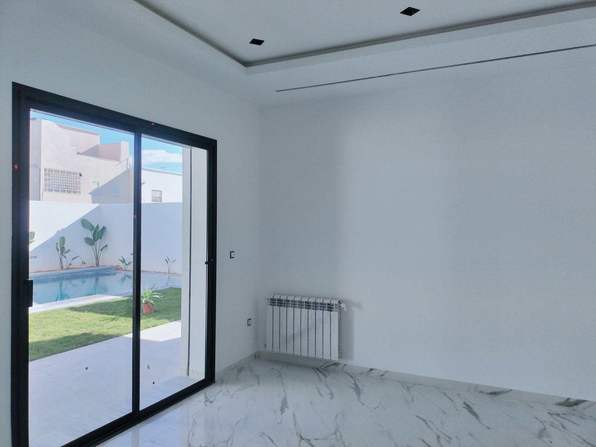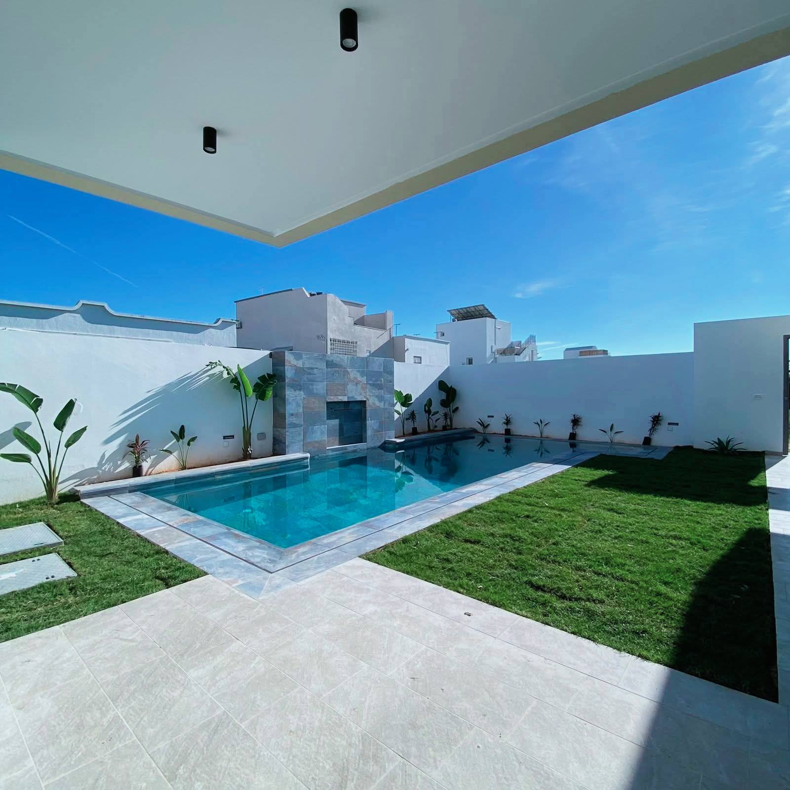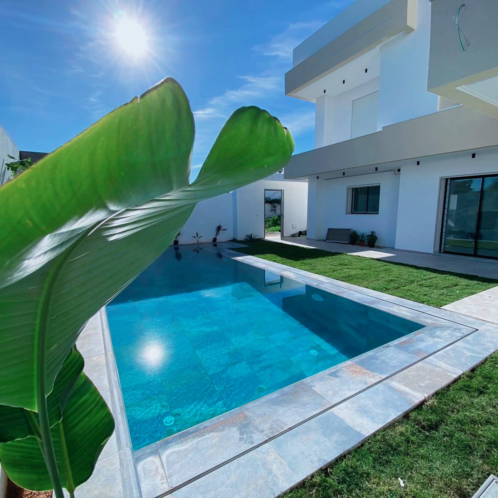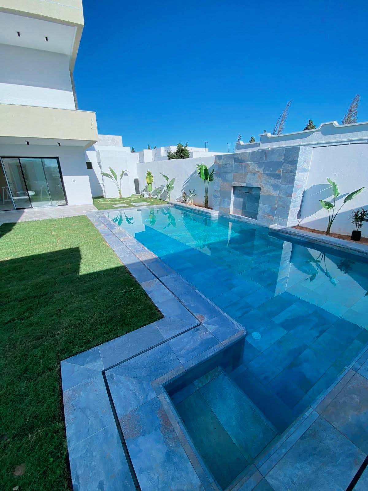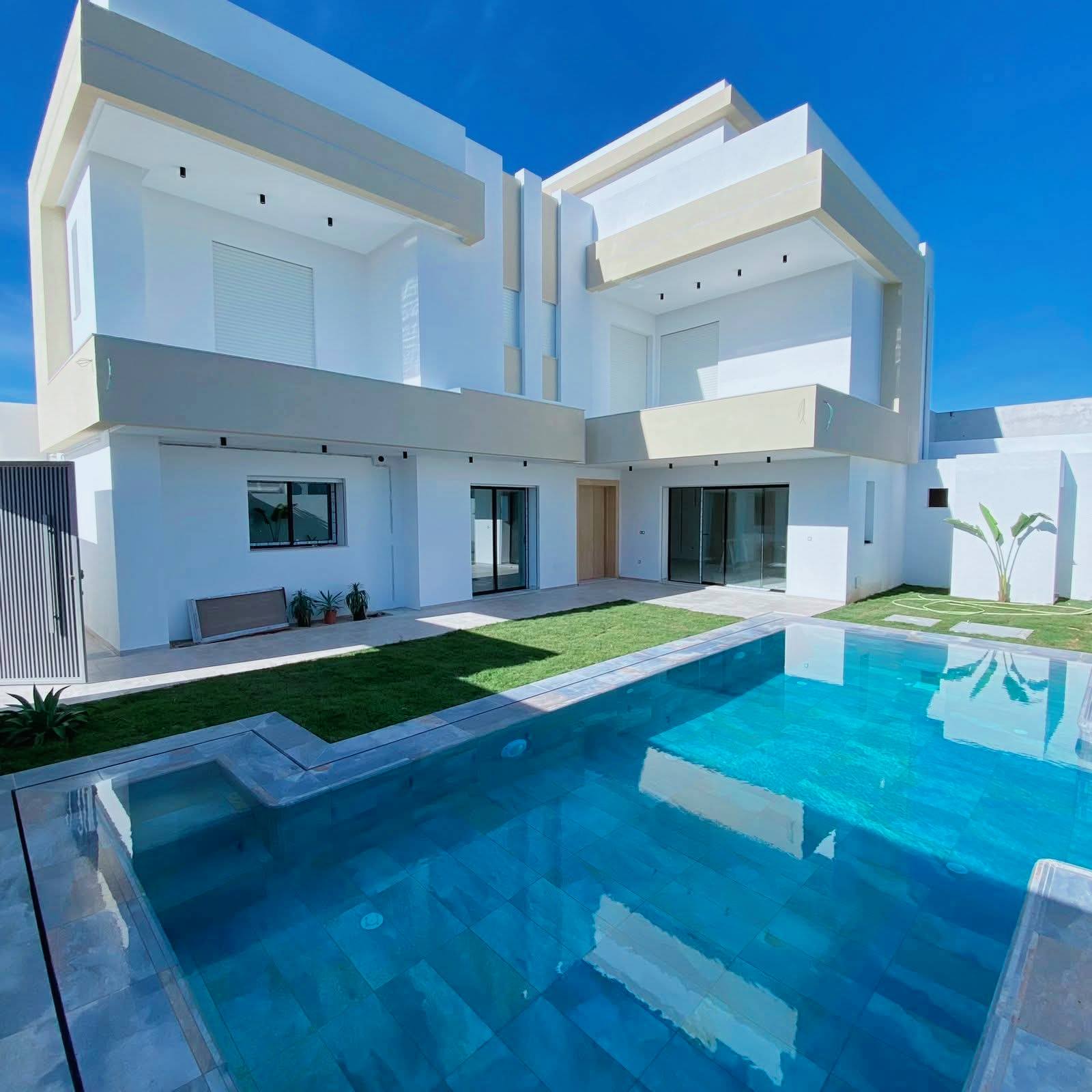 À Vendre – Villa de Charme Haut Standing S+5 | À 300 m de la plage Offrez-vous un cadre de vie luxueux et paisible , idéal pour résidence principale ou secondaire. Terrain : 305 m² Bâti : 350 m² R+2 Composition : Rez-de-chaussée Salon spacieux et lumineux avec baies vitrées Cuisine moderne équipée avec accès piscine Séjour